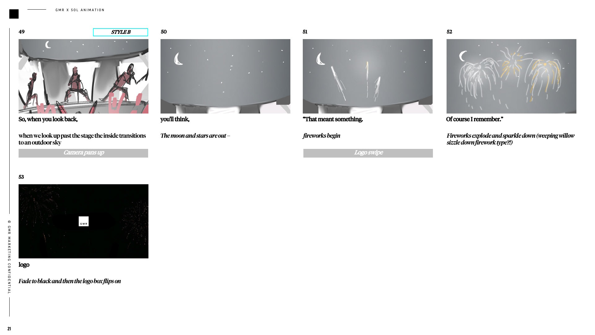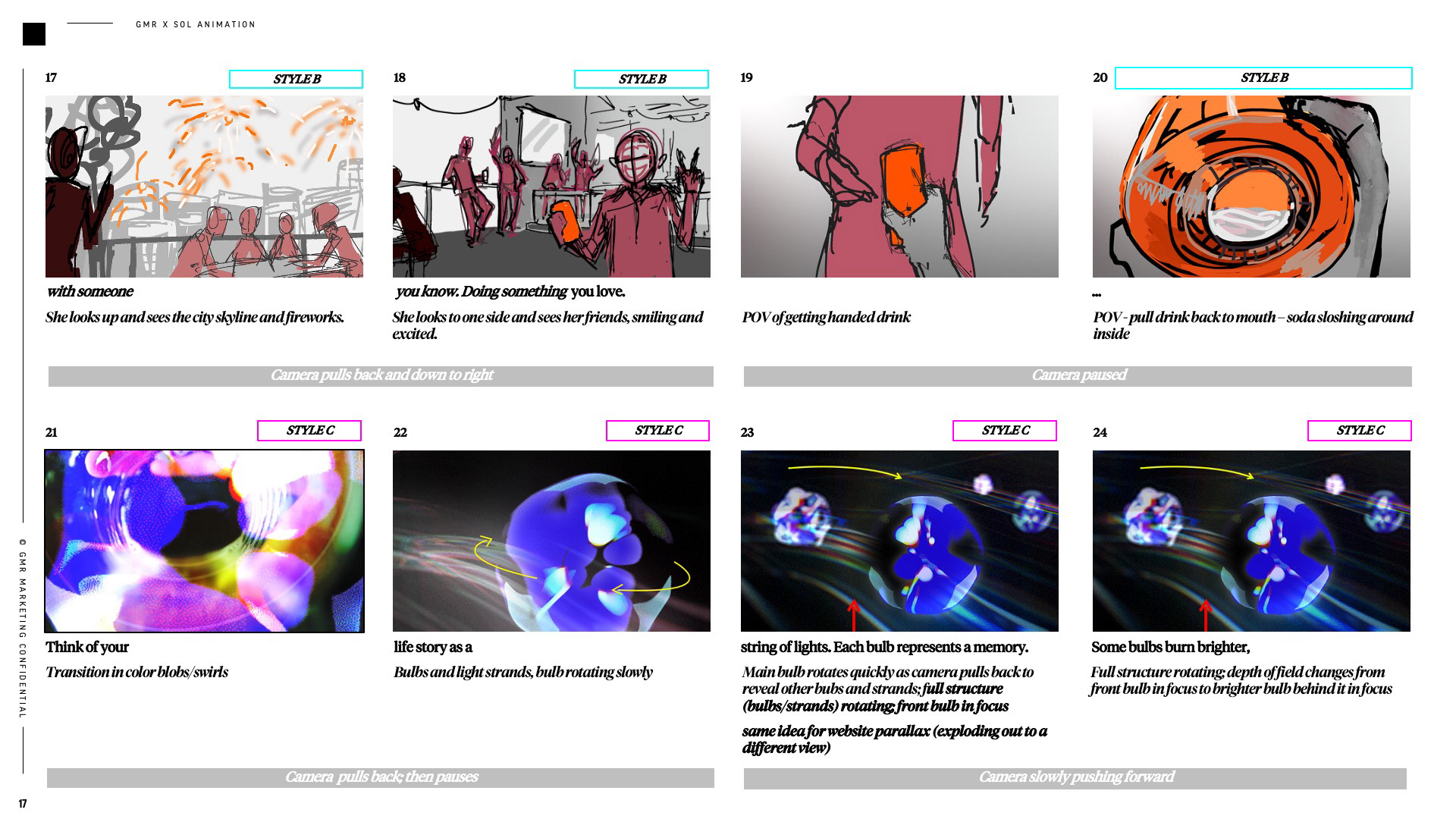 MY ROLE: Mood, style frames, storyboard, bulb and string design/animation, 3D layout for stat/title scene, fireworks effects, transitions and final compositing.