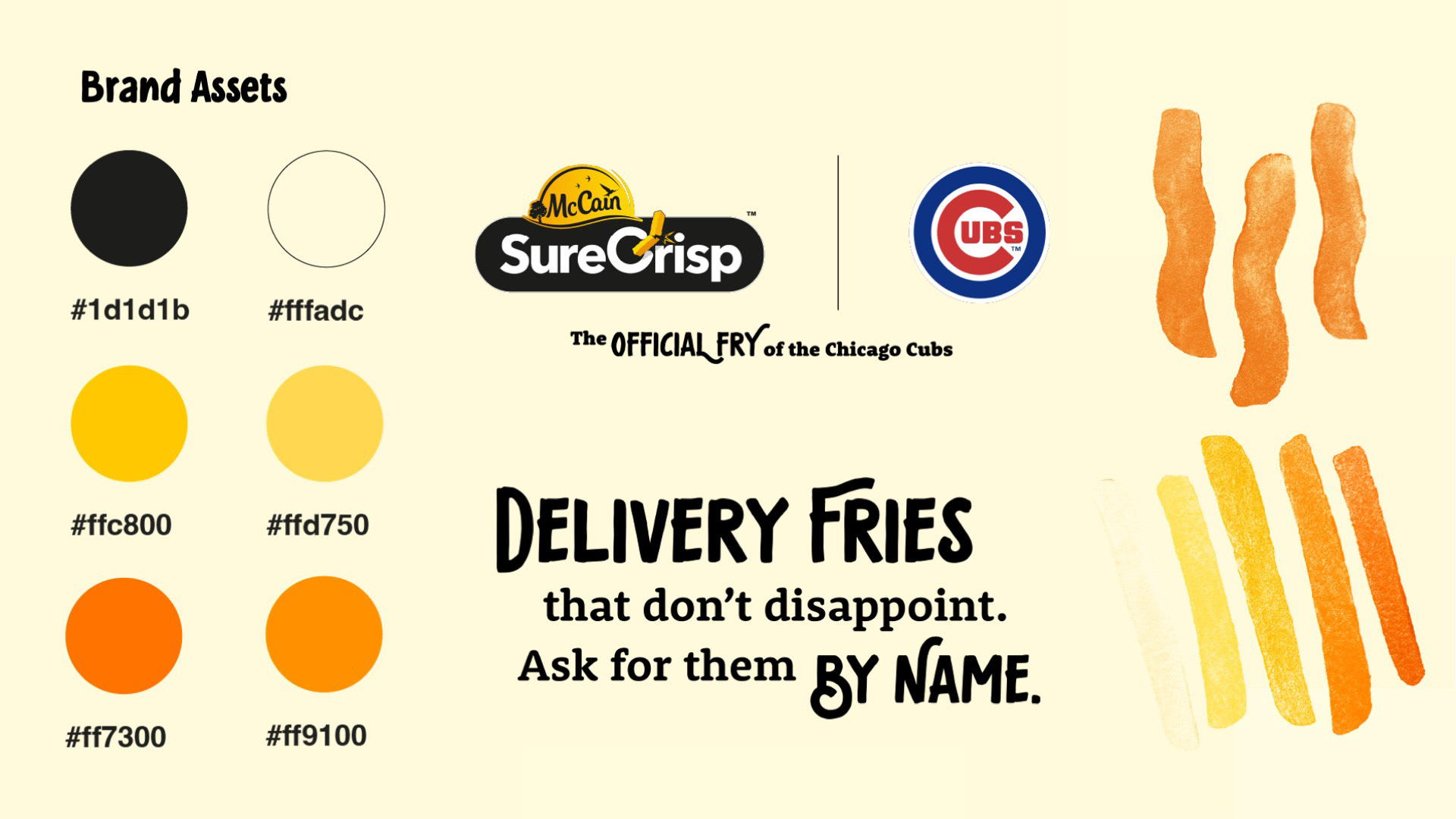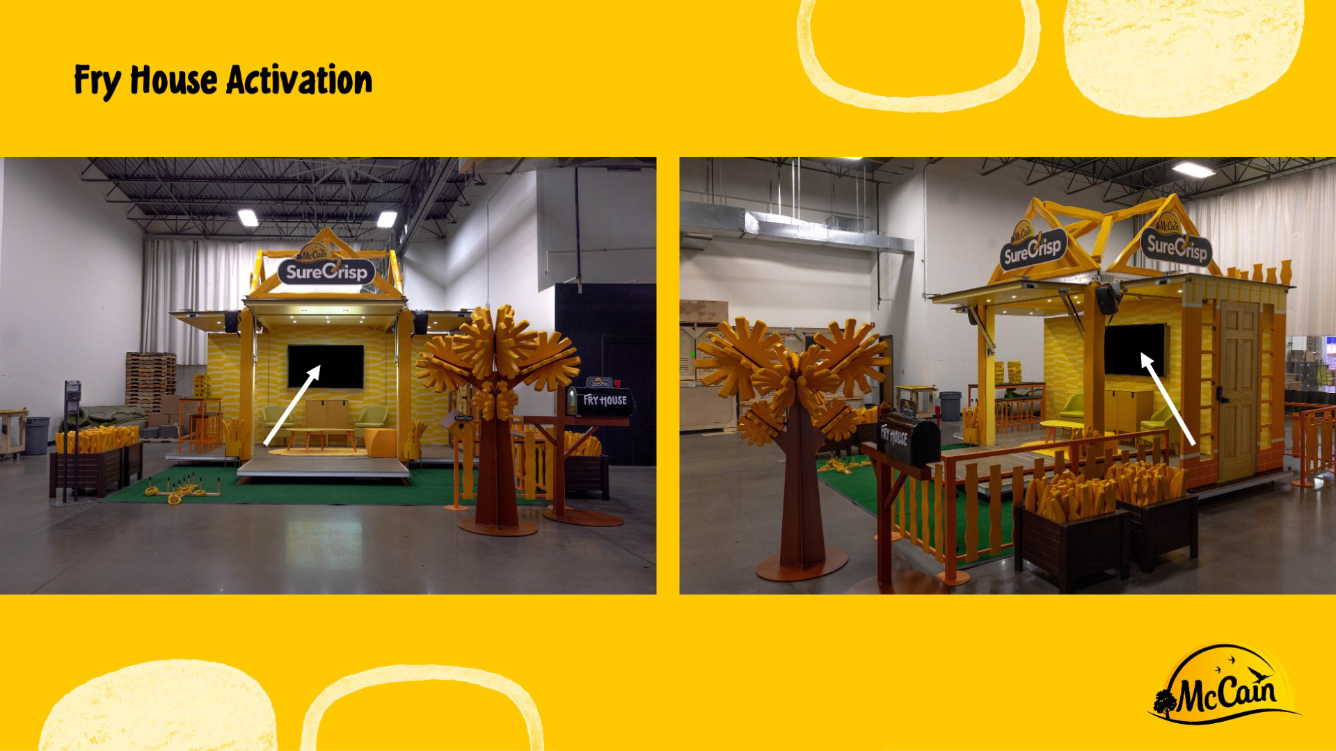 CONTEXT: McCain Foods partnered with the Chicago Cubs to sell its SureCrisp fries at Wrigley Field concessions. To support this partnership, GMR Marketing created the SureCrisp Fry House — a pop-up location at Gallagher Way near Wrigley Field. Within the space, a large digital screen displayed a 30 second looping animation that showcased the McCain SureCrisp brand and messaging. The video was also used across Wrigley Field concourse TVs to promote sale at nearby concessions.