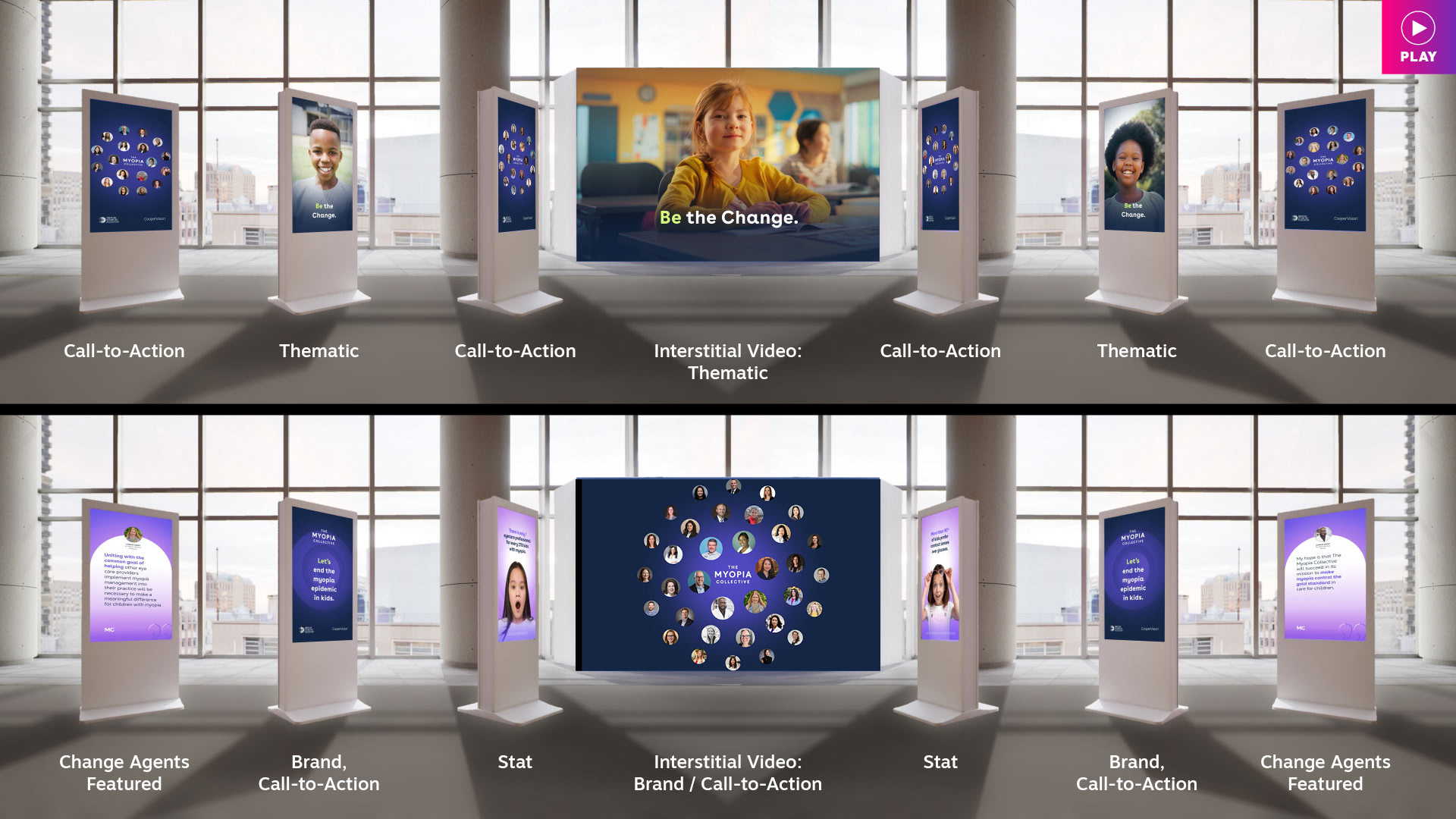 CONTEXT: GMR partnered with The Myopia Collective to create an interactive digital experience at The Optometry’s Meeting that encourages eyecare professionals to join the movement against myopia in kids. The activation featured a large pin wall with signup opportunities, interstitial videos, and surrounding totem screens that showcased stats, doctor insights, and current Change Agents (advocate Doctors of optometry).