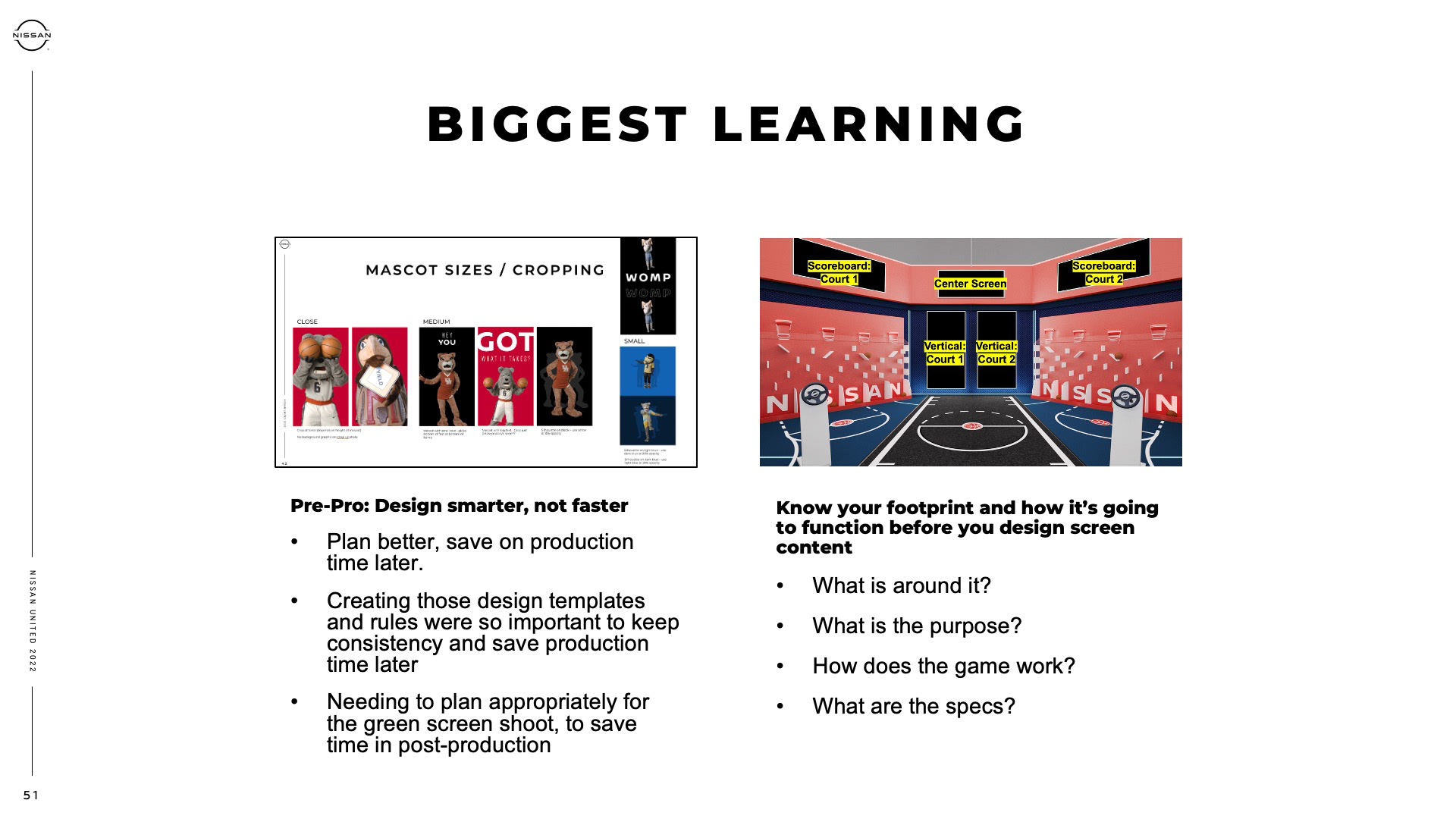 CONTEXT: Nissan is a sponsor to NCAA Final Four Men’s & Women’s Basketball – giving the brand an opportunity to continue to own the NCAA platform and grow new customers into the Nissan brand. GMR partnered with Nissan to bring the brand to life in a road trip inspired activation at the Men's and Women's games. From a larger-than-life, multi-player shooting game on the Thrill Court to local artist murals, fans found a fully-immersive brand experience.